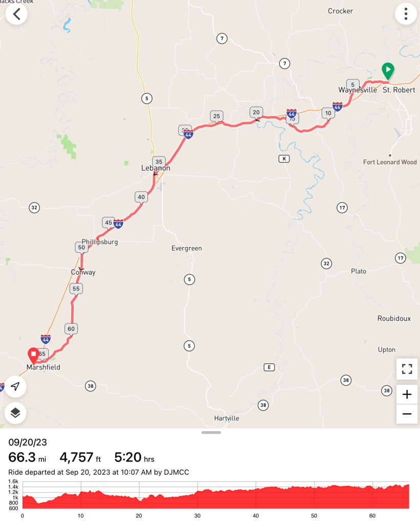 Over breakfast, we had decided that the weather would make this a short day: get into Lebanon, get lunch, then find a hotel, but we made good time getting to Lebanon despite the early rain, the skies were clearing and leaving pleasantly cool temperatures behind, and Marshfield was only 30 miles ahead. So we pressed on. (Tomorrow’s ride into The Other Springfield will be our short day, with a chance to find a laundromat and clean some clothes at the midpoint.)