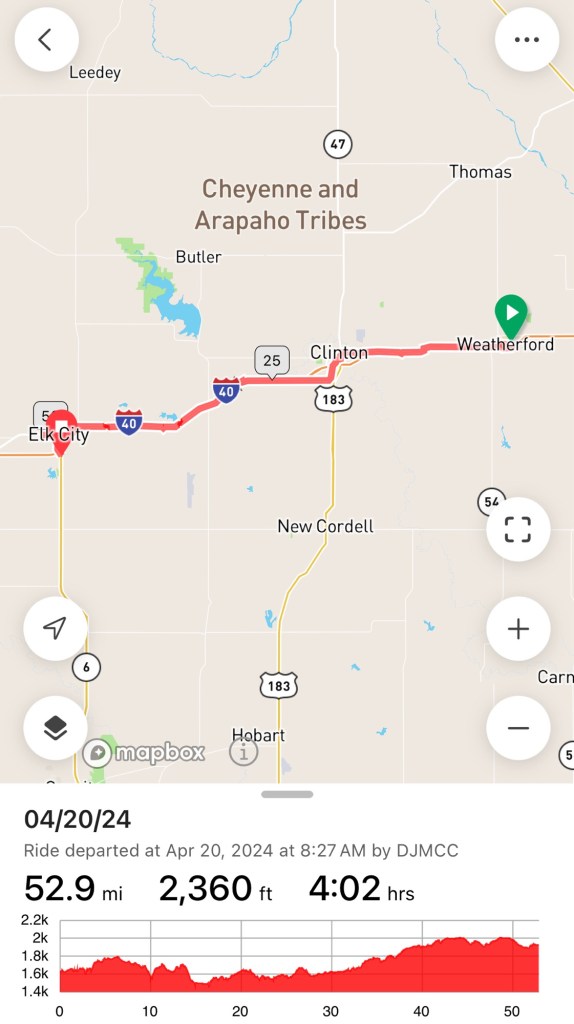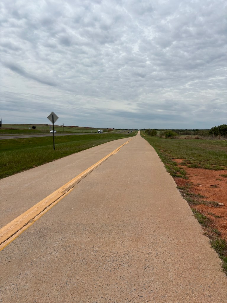 We left Weatherford a little after 9. Not too long into the ride, we passed another Route 66 cyclist heading east. He was by himself, and was carrying a good amount of gear, but I don’t think he was bikepacking; he was probably credit-card camping like us. He smiled and waved back at us, but the wind was in his teeth; he had a hard day ahead of him, so we didn’t pause to chat. The wind will be at his back soon enough, and we’ll be the ones laboring.